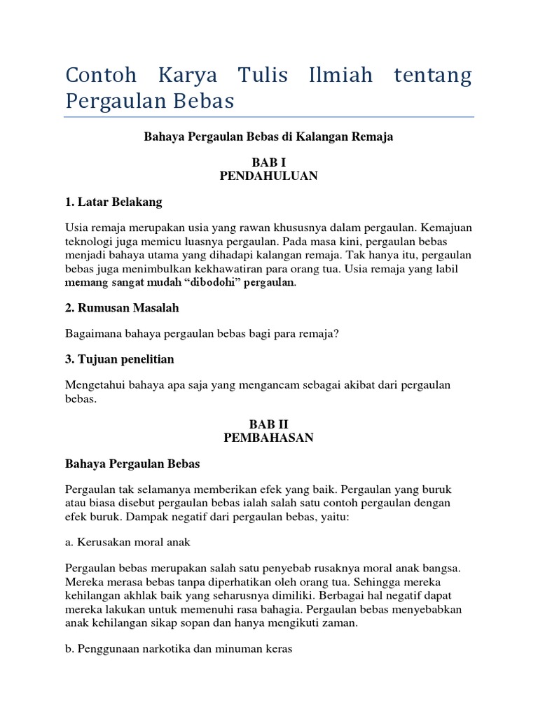 Pdf karya tulis ilmiah populer yonathan samudro. Karya tulis ilmiah tentang dampak pergaulan bebas bab i pendahuluan 1.1 latar belakang masalah remaja adalah generasi. Contoh karya tulis ilmiah bahasa inggris tentang pergaulan bebas the impact of promiscuity for teens chapter i introduction 1.1.