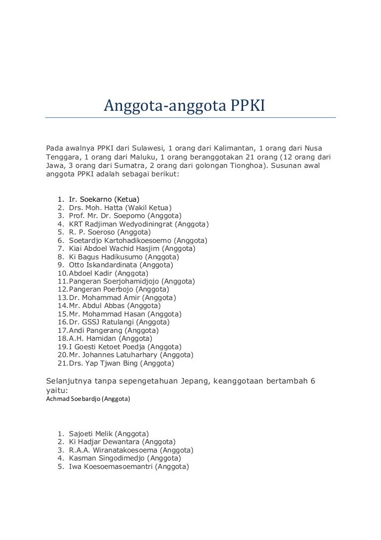 Apa tujuan dari pembentukan ppki? Pada awalnya, komposisi keanggotaan ppki hanya beranggotakan sejumlah 21 orang (12 orang dari daerah jawa, 3 orang dari sumatera, 2 orang dari sulawesi, 1 orang dari kalimantan, 1 orang yang berasal dari nusa tenggara, 1 orang berasal dari maluku, dan 1 orang berasal dari golongan tionghoa). Beradasarkan jumlah keterwakilan pulau, maka pulau jawa memiliki wakil yang paling banyak yaitu.