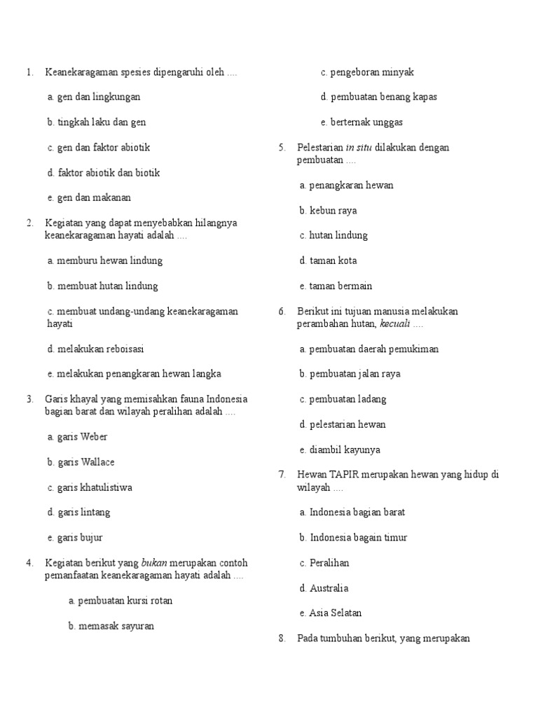 Soal dan jawaban keanekaragaman hayati kelas x. Hal tersebut sejalan dengan apa yang dinyatakan oleh terborgh, 1971 (dalam welty and baptista, 1988) bahwa keanekaragaman spesies burung dipengaruhi oleh struktur habitat dan lebih jauh lagi dipengaruhi oleh luas area yang didiaminya dan jarak area tersebut dengan area yang sama. Keanekaragaman hayati tidak terdistribusi secara merata.
