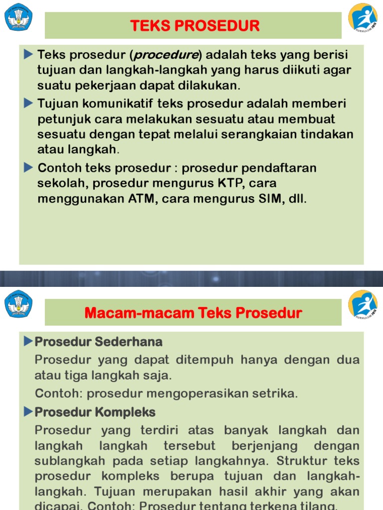 Poniyem bashirun, 39 tahun bekerja sebagai guru bahasa inggris. Tujuan teks prosedural adalah untuk memberikan pengantar umum sebagai indikasi apa yang sedang dilakukan atau apa yang sedang dilakukan, dan sebagai pembenaran untuk itu. Setelah mencermati beberapa teks prosedur, peserta didik diarahkan untuk berpikir apakah ciri umum teks prosedur sesuai teks yang dibaca/didengar.