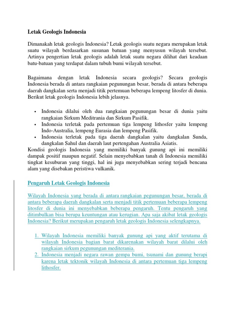 Lokasi indonesia secara geologis diapit jalur pegunungan sehingga memiliki banyak gunung berapi di wilayahnya. Baca juga keuntungan dan kerugian letak geologis indonesia. Berikut sejumlah dampak negatif dan positif dari letak.