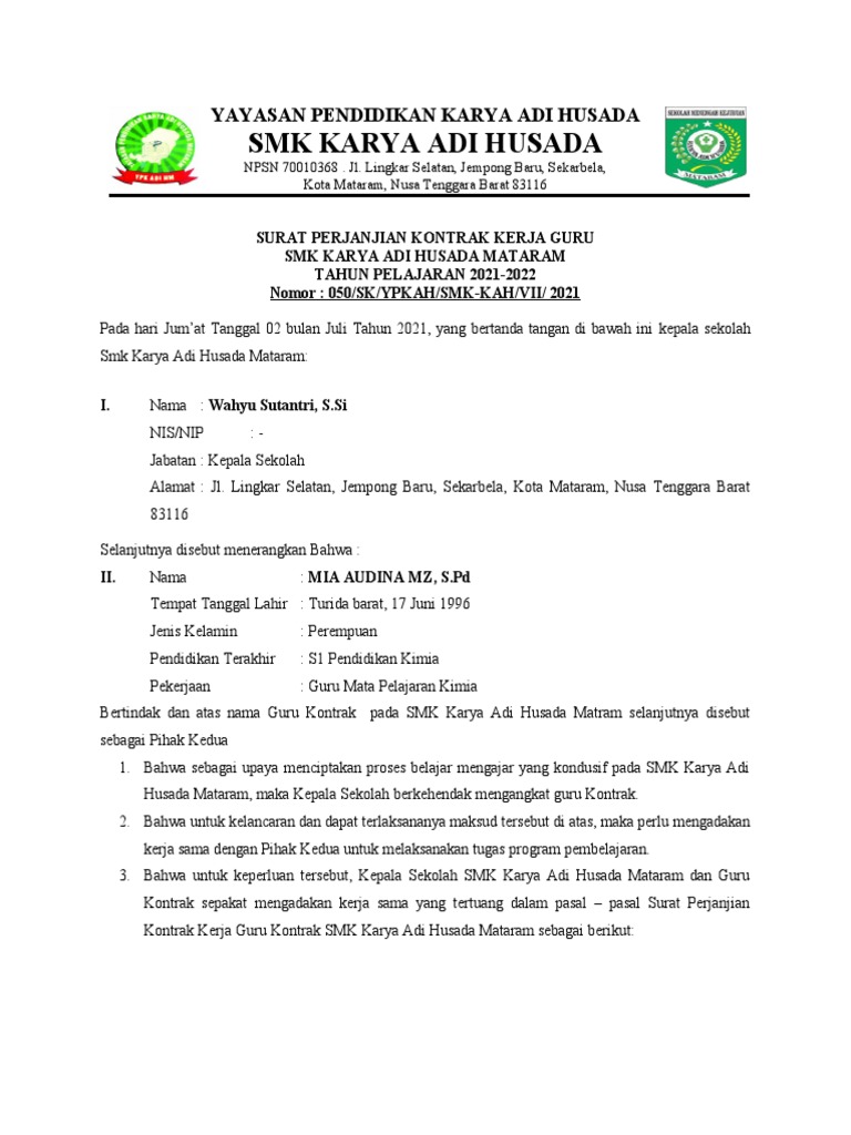 Contoh surat perjanjian kontrak kerja guru paud format microsoft word ini mungkin bermanfaat juga bagi anda yang membutuhkan referensi lainnya yang berhubungan seperti contoh surat kontrak kerja guru, contoh kontrak kerja guru swasta, kontrak kerja guru tetap yayasan, surat perjanjian guru dengan yayasan, contoh kontrak kerja guru paud, contoh surat perjanjian kerja guru tk, perjanjian kerja. Berdasarkan poin 1 dan 2 dipandang perlu menerbitkan surat keputusan pemberhentian dengan hormat sebagai guru tetap yayasan di lingkungan yayasan sabilirrasyad telagawar yang ditetapkan dalam sebuah keputusan ketua yayasan sabilirrasyad telagawaru. Masa kontrak kerja / perjanjian 1.